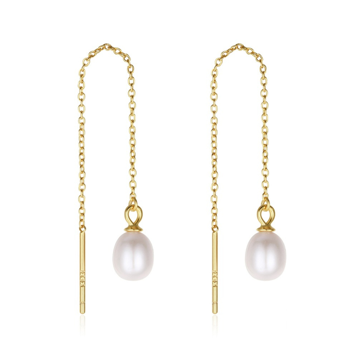 Cercei fini și eleganți din argint 925 placat cu aur 14K, decorați cu perle naturale de apă dulce de 5.5-6mm. Lungimea totală este de 77mm, iar greutatea perechii este de 2.2g. Produs lucrat manual, potrivit pentru ținute elegante sau casual, oferind un aspect clasic și rafinat.