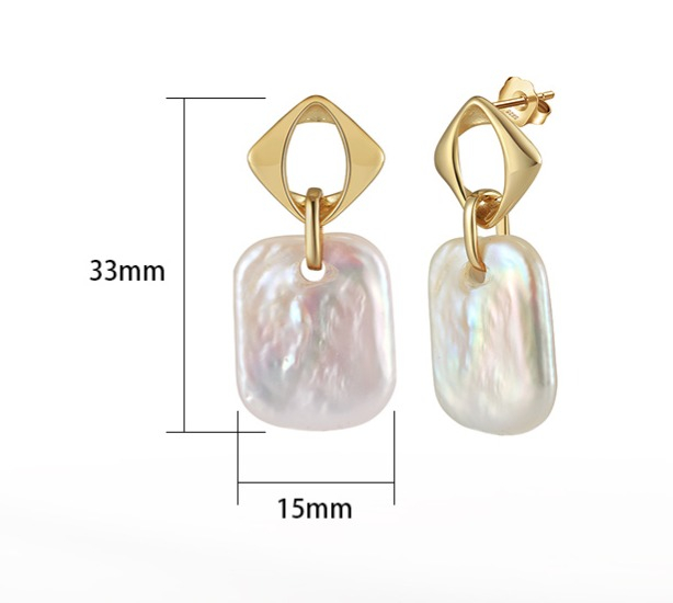 Cerceii Romb sunt confectionati din argint placat cu aur, accesorizați cu o perlă baroc elegantă. Cu o lungime totală de 3.3 cm, acești cercei combină frumusețea naturală a perlei baroc, fiecare având o formă unică, cu strălucirea caldă a aurului de 14k.