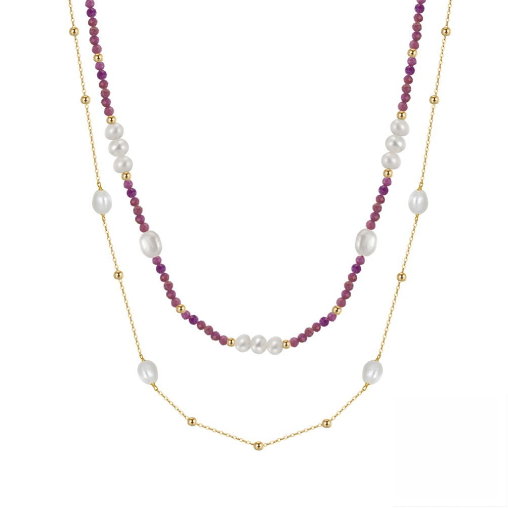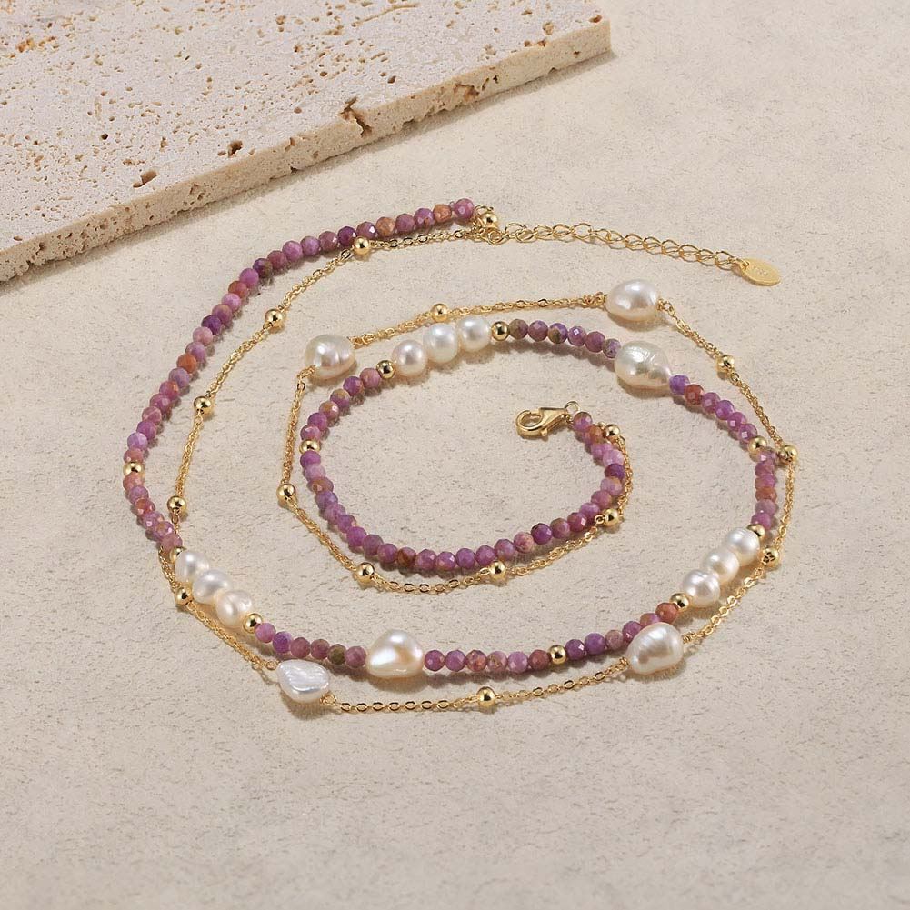Adaugă un plus de rafinament ținutelor tale cu acest colier deosebit, realizat din perle naturale de cultură, mica purpurie și argint placat cu aur de 14K. Designul unic îmbină frumusețea perlelor baroc cu delicatețea lanțului aurit, oferind un accesoriu sofisticat și atemporal.