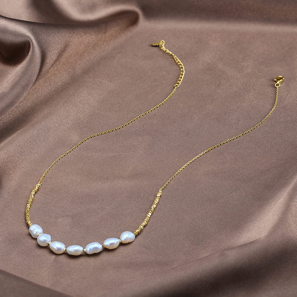 Perlele, cu dimensiuni generoase de aproximativ 5-7 mm, sunt dispuse în față și separate de mici pepite de argint aurit, adăugând o notă subtilă de sofisticare. Lungimea de 40 cm, cu o extensie suplimentară de 5 cm, asigură versatilitate, potrivindu-se perfect atât ținutelor casual, cât și celor elegante.